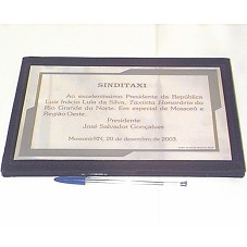 PLACA (25X17 CM) EM METAL PRATEADO POLIDO, COM MOLDURA EM METAL FOSQUEADO E INSCRIÇÃO 'SINDITAXI / AO EXCELENTÍSSIMO PRESIDENTE DA REPÚBLICA LUIZ INÁCIO LULA DA SILVA, TAXISTA HONORÁRIO DO RIO GRANDE DO NORTE. EM ESPECIAL DE MOSSORÓ E REGIÃO OESTE. PRESIDENTE JOSÉ SALVADOR GONÇALVES / MOSSORÓ/RN, 20 DE DEZEMBRO DE 2003.'. FIXADA EM BASE DE PAPELÃO, FORRADA DE VELUDO AZUL MARINHO, FORMANDO UMA CAPA.
