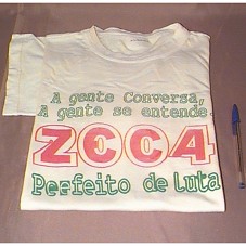 CAMISETA EM MALHA CREME, DE MANGA CURTA. NA FRENTE, EM VERDE E VERMELHO, 'A GENTE CONVERSA, A GENTE SE ENTENDE. 2004/ZECA PREFEITO DE LULA/ PERFEITO DE LUTA'. CAMISETA USADA E POUCO SUJA.