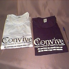 02 (DUAS) CAMISETAS (TAM G) EM MALHA DE ALGODÃO, UMA BRANCA COM INSCRIÇÃO EM PRETO E A OUTRA PRETA, COM INSCRIÇÃO EM BRANCO 'CONVIVE - COMITÊ NACIONAL DE VÍTIMAS DA VIOLÊNCIA - NÃO QUEREMOS QUE NINGUÉM SINTA A DOR QUE NOS LEVOU A FAZER ESTA CAMPANHA'.