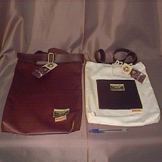 02 (DUAS) BOLSAS: UMA CONFECCIONADA EM TECIDO DE ALGODÃO CRU, COM BOLSO E ALÇA EM COURO VEGETAL DA AMAZÔNIA (TREETAP) MARROM ESCURO E FECHAMENTO EM CORDÃO; A OUTRA, TODA EM COURO VEGETAL MARROM COM FECHAMENTO EM ZÍPER. AMBAS COM EMBLEMAS DA CONFERÊNCIA NACIONAL DO MEIO AMBIENTE - CONFERÊNCIA INFANTO-JUVENIL E DA PIRELLI.
