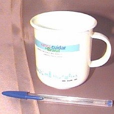 CANECO DE PLÁSTICO, BRANCO, COM EMBLEMA DA CONFERÊNCIA NACIONAL DO MEIO AMBIENTE - CONFERÊNCIA INFANTO JUVENIL, EM AZUL E ESCRITO EM VERMELHO, AZUL E VERDE 'VAMOS CUIDAR DO BRASIL'.