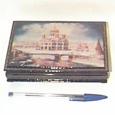 CAIXA EM MADEIRA (3X16X11CM), PINTADA DE PRETO COM DETALHES DOURADO. NA TAMPA, FOTOGRAFIA DE MOSCOU.