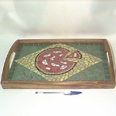 BANDEJA (38X25X5 CM) EM MADEIRA COM MOSAICO EM VERDE E AMARELO SIMBOLIZANDO A BANDEIRA DO BRASIL. AO CENTRO, MOSAICO EM TONS DE VERMELHO E BRANCO REPRESENTANDO UMA PIZZA.