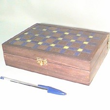 ESTOJO (6X21X15 CM) EM MADEIRA, COM DIVISÓRIAS, FORRADO INTERNAMENTE COM VELUDO CINZA E TAMPA COM MOSAICO EM TONS DE AZUL, AMARELO E MARROM.