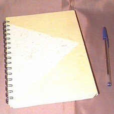 CADERNO ESPIRAL CONFECCIONADO COM MATERIAL RECICLÁVEL. CAPA EM TONS DE BEGE E AMARELO.