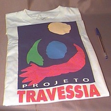 CAMISETA EM MALHA DE ALGODÃO BRANCA, TAM. G, COM SERIGRAFIA DO PROJETO TRAVESSIA, EM TONS DE ROXO, AMARELO, AZUL, VERDE E VERMELHO.