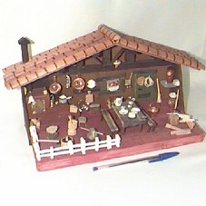COZINHA, EM MADEIRA, CONTENDO FOGÃO À LENHA, MESA COM 02 (DOIS) BANCOS, PRATELEIRA, FILTRO, BAÚ, RÁDIO, VASSOURA, ENXADA, MACHADO, LENHA, CHAPÉU, E TODOS OS UTENSÍLIOS (PANELAS, PRATOS, XÍCARAS, BULE, RALO, TÁBUA, BALDE, ETC), TELHADO E CHAMINÉ.