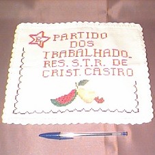 CAPA DE ALMOFADA (27X23 CM), EM ETAMINE, BORDADA EM PONTO DE CRUZ VERMELHO A ESTRELA DO PT E A INSCRIÇÃO 'PARTIDO DOS TRABALHADORES. S.T.R. DE CRIST. CASTRO'. ABAIXO, BORDADO DE UMA FATIA DE MELANCIA, EM VERDE, VERMELHO E PRETO E DE UM CAJU, EM AMARELO E MARROM. CONTORNADA POR BICO DE CROCHÊ BRANCO.