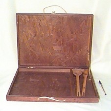 PASTA EM MADEIRA, COM DIVISÓRIA, CONTENDO UMA UM GARFO E UMA COLHER DE PAU. ALÇA EM CORDA.