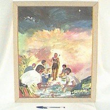 QUADRO (44,5X54,5 CM) COM MOLDURA EM MADEIRA. EMOLDURA PINTURA (40X50 CM) REPRESENTANDO JESUS ENTRE OS PESCADORES. PREDOMINA TONS DE AZUL, AMARELO E MARROM. NO CANTO INFERIOR DIREITO, ASSINATURA DO ARTISTA 'DORAPIMO'. NA PARTE INFERIOR DA MOLDURA, PLACA COM A INSCRIÇÃO 'CINCO'.