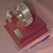 ESCULTURA, EM METAL PRATEADO, COM O SÍMBOLO DA MICHELIN, SOBRE BASE DE MADEIRA E PLACA COM A GRAVAÇÃO DO EMBLEMA DA MICHELIN.