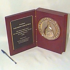 PRÊMIO NOTRE DAME, DE RECONHECIMENTO A EXCELÊNCIA DOS SERVIÇOS PRESTADOS AO PÚBLICO E À COMUNIDADE NA AMÉRICA LATINA. COMPOSTO POR LIVRO EM MADEIRA CONTENDO DUAS PLACAS: UMA PLACA PRETA, GRAVADA EM DOURADO 'PRESIDENT LUIZ INÁCIO LULA DA SILVA THE NOTRE DAME PRIZE FOR DISTINGUISHED PUBLIC SERVICE IN LATIN AMERICA 2003 - SPONSORED BY THE COCA-COLA FOUNDATION AND THE HELEN KELLOGG INSTITUTE FOR INTERNATIONAL STUDIES; A OUTRA, EM METAL, TRAZ O EMBLEMA DA 'UNIVERSITY OF NOTRE DAME'.