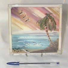 PINTURA EM AZULEJO (15X15 CM). IMAGEM DE UM COQUEIRO À BEIRA MAR, COM ALGUNS PÁSSAROS. PREDOMINAM OS TONS DE AZUL, MARROM, LILÁS E VERDE. NO CANTO INFERIOR ESQUERDO, 'A. MARQUES / 15.2.03'. PROTEGIDA POR VIDRO. ACOMPANHA SUPORTE DE MESA.