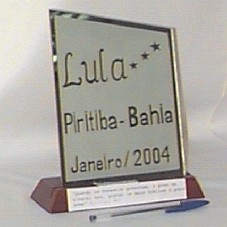 PLACA (15,2X20,5 CM) EM VIDRO ESPELHADO E JATEADO, COM A INSCRIÇÃO 'LULA / PIRITIBA-BA / JANEIRO/2004'. FIXADA EM BASE TRAPEZOIDAL DE MADEIRA (19,5X6,5X2,7 CM). NA BASE, PAPEL COM A INSCRIÇÃO 'PRESIDENTE / 'QUANDO OS HONESTOS GOVERNAM, O POVO SE ALEGRA; QUANDO OS MAUS DOMINAM O POVO GEME' / PROVÉRBIO 29:2'. ATRÁS, PAPEL COM OS NOMES DOS COMPONENTES DO SINDICATO DOS SERVIDORES MUNICIPAIS DE PIRITIBA-BA.