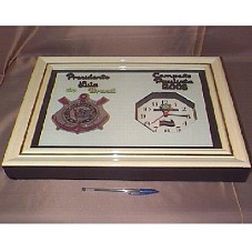 QUADRO (48X38 CM) CONTENDO UM RELÓGIO E UM EMBLEMA DO TIME DE FUTEBOL CORINTHIANS PAULISTA. POSSUI A INSCRIÇÃO 'PRESIDENTE LULA DO BRASIL / CAMPEÃO PAULISTA 2003'. ATRÁS, 'PARA O NOSSO PRESIDENTE LULA, UMA PEQUENA LEMBRANÇA, DE ALGUÉM QUE VOLTOU A ACREDITAR QUE O BRASIL, TEM JEITO SIM!! SÓ DEPENDE DE NÓS. DE CADA UM FAZER A SUA PARTE. UM ABRAÇO, CAMPELLO. JANEIRO/2004 / CAMPELLO 4581-8682'.