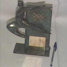 ESCULTURA EM GRANITO (20 CM), EM TONALIDADE VERDE. FIGURA HUMANA MASCULINA, COM PERNAS E BRAÇO PARA TRÁS, COMO SE ESTIVESSE SALTANDO. PRESA A UM RETÂNGULO (LEMBRA UM LIVRO), ONDE HÁ O SÍMBOLO DAS OLIMPÍADAS EM DOURADO, E A INSCRIÇÃO 'CIO * IOC'; E UM PLACA DOURADA (6X6 CM) COM MESMO SÍMBOLO E A ASSINATURA 'JACQUES ROGGE'. ACONDICIONADA EM SACO AVELUDADO VERDE.
