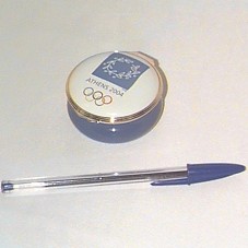 PORTA JÓIAS (6X3,2 CM), EM PORCELANA PINTADA DE AZUL, COM TAMPA BRANCA E DETALHES EM METAL DOURADO. NA TAMPA, O SÍMBOLO DAS OLIMPÍADAS E A INSCRIÇÃO 'ATHENS 2004. ACONDICIONADO EM CAIXA (10,7X12X5 CM) AZUL MARINHO COM MESMO SÍMBOLO NA TAMPA.