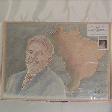 PINTURA (74,5X54 CM) EM AQUARELA. RETRATO DO PRESIDENTE LUIZ INÁCIO LULA DA SILVA, TENDO O MAPA DO BRASIL AO FUNDO. NO CANTO INFERIOR DIREITO, ASSINATURA DO ARTISTA. MOLDURA EM MADEIRA (77,5X57 CM) E TAMPO DE VIDRO. NO CANTO SUPERIOR DIREITO DO QUADRO, DOIS PAPÉIS COLADOS, O PRIMEIRO COM A INSCRIÇÃO 'ON THE OCCASION OF HIS VISIT TO MUMBAI, THE PORTRAIT OF H. E. MR. LUIZ INÁCIO LULA DA SILVA HON'BLE PRESIDENT OF THE FEDERATION REPUBLIC OF BRAZIL. 28-01-2004 / (PRESENTED BY HON. CONSUL OF BRAZIL, DR. ANIL KADAKIA.)'; O SEGUNDO, COM INFORMAÇÕES SOBRE O ARTISTA. NA PARTE POSTERIOR, OUTRAS INFORMAÇÕES SOBRE O MESMO.