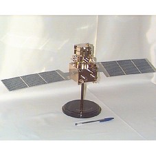 MAQUETE DO SATÉLITE IRS-P6 (60X26 CM) EM METAL DOURADO, COM DUAS LÂMINAS EM METAL PRATEADO, APARAFUSADAS CADA UMA EM UMA DAS LATERAIS. FIXADO EM BASE PLÁSTICA, COM A INSCRIÇÃO 'IRS-P6 / SCALE 1:20 / RESOURCE SAT'. ACODICIONADO EM CAIXA DE PAPELÃO (16X16X29 CM), TENDO NA TAMPA CARTÃO DE VISITA DO REMETENTE.