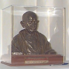 BUSTO (APROXIMADAMENTE 28 CM) EM BRONZE, DE GANDHI. FIXADO EM BASE DE MADEIRA (34X23,5X6 CM) E PROTEGIDO POR REDOMA DE ACRÍLICO. NA PARTE FRONTAL DA BASE, PLACA DOURADA COM A INSCRIÇÃO 'MOHANDAS KARAMCHAND GANDHI / OCT. 2, 1869 TO JAN. 30. , 1948'. NA PARTE POSTERIOR DA PEÇA, ASSINATURA DO ARTISTA, 'RAM V. SUTAR 903'. E, PAPEL COLADO NA REDOMA, CONTENDO A INSCRIÇÃO 'PRESENTED WITH COMPLIMENTS TO HIS EXCELLENCY MR. LUIZ INÁCIO LULA DA SILVA PRESIDENT OF BRAZIL ON HIS VISIT TO GANDHI SAMADHI (MEMORIAL) AT RAIGAT, NEW DELHI ON SUNDAY, JANUARY 25, 2004...'.