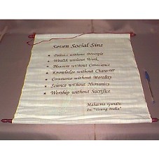 BANNER EM TECIDO CREME (44X45,5 CM), TENDO A ENUMERAÇÃO DOS 'SEVEN SOCIAL SINS', POR MAHATMA GANDHI, EM 'YOUNG INDIA'.
