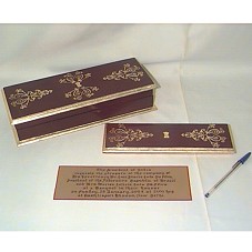 CONVITE ESCRITO EM FOLHA DE MADEIRA, DESTINADO AO PRESIDENTE LULA E À PRIMEIRA DAMA MARISA, EM NOME DO PRESIDENTE DA ÍNDIA ABDUL KALAN. ACONDICIONADO EM CAIXA DE MADEIRA (30,3X11,2X7 CM) TRABALHADA COM PINTURA INDIANA DOURADA.