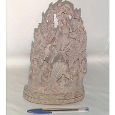 ESCULTURA EM PEDRA (24 CM), EM TONS DE LILÁS. FIGURA DO DEUS HINDU VISHNU, RODEADO POR SEREIAS E RAMOS. ACOMPANHA CARTÃO COM A INSCRIÇÃO 'A TOKEN IN MEMORY OF THE VISIT TO INDIA OF HE PRESIDENT OF BRASIL & MRS LULA DA SILVA. WITH WARM REGARDS, SR DIRECTOR & STAFF, CRAFTS MUSEUM, MINISTRY OF TEXTILES.'. ACONDICIONADA EM CAIXA FORRADA COM PAPEL EM TONS DE MARROM.