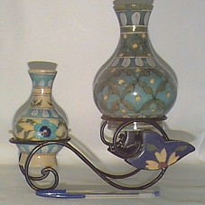 DOIS VASOS PEQUENOS (H= 16 E 12,5 CM) DE PORCELANA. O MENOR É AMARELO COM PINTURAS EM AZUL E VERDE, MOTIVOS FLORAIS. O OUTRO, AZUL, COM PINTURAS VERDES E AMARELAS. ACOMPANHA SUPORTE DE FERRO, COM LUGAR PARA COLOCÁ-LOS.