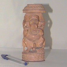 ESCULTURA EM MADEIRA (13 CM). FIGURA DO DEUS HINDU GANESHA, SENTADO EM UMA CADEIRA COM UM SOMBREIRO.