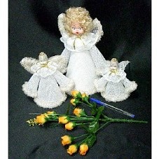 TRÊS ANJOS, BRANCOS COM DETALHES DOURADOS, EM TAMANHOS DIFERENTES, CONFECCIONADOS ARTESANALMENTE COM CONES DE TELA E RENDA. ACOMPANHA RAMO, ARTIFICIAL, DE BOTÕES AMARELOS.