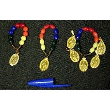 03 (TRÊS) MINI-TERÇOS (OU TERÇOS DE DEDO), CONFECCIONADOS COM CONTAS COLORIDAS, E 04 (QUATRO) MEDALHAS DE MARIA IMACULADA, EM METAL DOURADO.