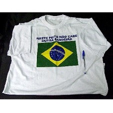 CAMISETA BRANCA EM MALHA DE ALGODÃO. NA FRENTE, BANDEIRA DO BRASIL E A INSCRIÇÃO EM AZUL 'NESTE PEITO NÃO CABE OUTRA BANDEIRA'.
