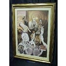 QUADRO (89X68CM) COM PINTURA RETRATANDO, AO FUNDO, UM HOMEM COM A MÃO NO ROSTO E UMA MULHER COM AS MÃOS NOS OUVIDOS, E, EM PRIMEIRO PLANO, VÁRIAS MÃOS (MASCULINAS E FEMININAS) SEGURANDO UM MARTELO, UM TERÇO, UM TELEFONE, UM MAÇO DE DINHEIRO. MOLDURA EM MADEIRA DOURADA E PASSE-PARTOUT BEGE.