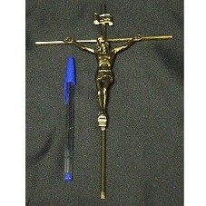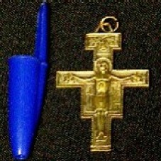 CRUCIFIXO (4X3 CM) EM METAL DOURADO, SEMELHANTE A UMA CRUZ PATRIARCAL, TRAZENDO EM ALTO RELEVO A IMAGEM DE JESUS CRISTO PREGADO NA CRUZ E CENAS DE SUA VIDA PÚBLICA. O VERSO TRAZ UMA CRUZ DE TAU E A INSCRIÇÃO 'ASSISI / BENEDICAT TIBI DOMINUS ET CUSTODIAT TE + OSTENDAT FACIEM SUAM TIBI ET MISEREATUR TUI + CONVERTAT VULTUM SUUM AD TE ET DET TIBI PACEM + DOMINUS BENEDICAT TE'.
