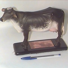 ESCULTURA (17 CM), FIGURA DE UMA VACA DA RAÇA GIROLANDO. FIXADA EM BASE RETANGULAR PRETA (20,5X7,5X1,5 CM), COM PLACA NA PARTE CENTRAL, CONTENDO A GRAVAÇÃO 'AO PRESIDENTE LULA / COM APREÇO DA GIROLANDO, RAÇA BRASILEIRA: A ESPERANÇA DA VIABILIZAÇÃO DA PECUÁRIA LEITEIRA TROPICAL. UBERABA - MG, 19.02.2004'.