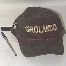 BONÉ EM COURO E ALGODÃO VERDE. NA FRENTE, BORDADO EM VERDE CLARO, 'GIROLANDO'; NA LATERAL, 'G' E A CABEÇA DE UM GADO.