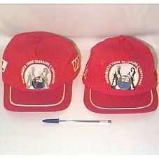DOIS BONÉS EM BRIM VERMELHO. NA FRENTE, ESTAMPA DE UM GLOBO SENDO SEGURADO POR UM CASAL E A INSCRIÇÃO 'MOVIMENTO TERRA TRABALHO E LIBERDADE / MTL'. NAS LATERAIS, SIGLA E NOME DO MOVIMENTO.