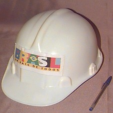 CAPACETE DE OBRA, NA COR BRANCA. NA FRENTE, PAPEL COLADO CONTENDO A INSCRIÇÃO 'BRASIL / UM PAÍS DE TODOS'.