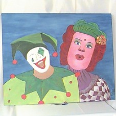 PINTURA EM TELA (105X80 CM). IMAGEM DE UM PIERRÔ SORRINDO E UMA MULHER ATRÁS DELE. PREDOMINA OS TONS DE VERDE, BRANCO E LILÁS EM FUNDO AZUL. NO CANTO INFERIOR DIREITO, 'ZELMA 2002'. ATRÁS, ETIQUETA COLADA NA MOLDURA 'CARNAVAL EM OLINDA / R$ 250,00'.