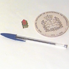 BÓTON (2X1,5 CM) EM METAL DOURADO. NA FRENTE, BRASÃO VERMELHO CIRCUNDADO POR RAMOS VERDES. NA PARTE INFERIOR, 'RHP'. MEDALHA EM METAL PRATEADO, TENDO EM UMA DAS FACES A FACHADA DE UM PRÉDIO E A INSCRIÇÃO 'REAL HOSPITAL PORTUGUÊS DE BENEFICENCIA'; E, NA OUTRA, 'REAL HOSPITAL PORTUGUÊS DE BENEFICENCIA EM PERNAMBUCO / 1855 -1995', JUNTAMENTE COM O MESMO BRASÃO DO BÓTON. ACONDICIONADOS EM CAIXA AZUL MARINHO (11X11X2,5 CM).