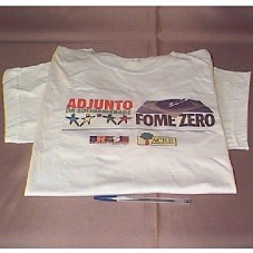 CAMISETA (TAM GG) EM MALHA BRANCA, DE MANGA CURTA. NA FRENTE, SÍMBOLO DO PROGRAMA 'FOME ZERO', 'ADJUNTO DA SOLIDARIEDADE', 'ACRE GOVERNO FLORESTA' E 'BRASIL UM PAÍS DE TODOS'. ATRÁS, EM VERMELHO E VERDE, 'ADJUNTO / EXPRESSÃO ACREANA DO FOME ZERO'.