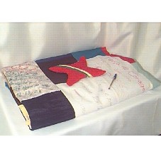 COLCHA DE RETALHOS (194X200 CM) COM FORRO EM TNT BRANCO. NA MAIORIA DOS RETALHOS, MENSAGENS MANUSCRITAS PARA O PRESIDENTE LULA. NO CENTRO DA COLCHA, UMA ALMOFADA, ESTRELA DE QUATRO PONTAS, VERMELHA, COM DUAS FAIXAS (UMA VERDE E UMA AMARELA) COSTURADAS NELA.