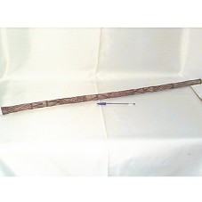 FLAUTA (87,5X2 CM) EM MADEIRA OCA, COM DESENHOS GEOMÉTRICOS GRAVADOS AO LONGO DELA. EM UMA DAS PONTAS,POSSUI TRÊS ANÉIS DE FERRO EM SEU INTERIOR.