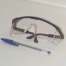 ÓCULOS PROTETOR, COM LENTE EM PLÁSTICO TRANSPARENTE E ARMAÇÃO EM PLÁSTICO PRETO. POSSUI PERNAS REGULÁVEIS.