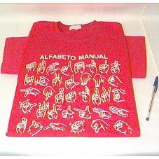 CAMISETA (TAM G) EM MALHA VERMELHA, DE MANGA CURTA. NA FRENTE, ESTAMPA, EM BRANCO, 'ALFABETO MANUAL' E OS SÍMBOLOS DO MESMO.