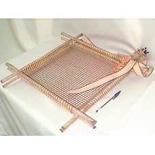 CESTA (37X38X5 CM) EM PALHA COM ARMAÇÃO EM PEDAÇOS CIRCULARES DE MADEIRA. POSSUI EM UMA DAS EXTREMIDADES UM ENFEITE COM FITA DE PALHA, FLORES SECAS E FITILHO.