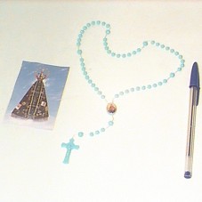 TERÇO COM CONTAS PLÁSTICAS AZUIS. ACOMPANHA 'ORAÇÃO A NOSSA SENHORA APARECIDA', EM SANTINHO DE PAPEL.