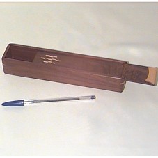 ESTOJO (20,7X4,2X3,5 CM) EM MADEIRA, COM DETALHES EM MARCHETARIA NAS LATERAIS E NA TAMPA. ACOMPANHA CARTÃO DO REMETENTE 'SR. EMB. BLANCA NIEVES PORTOCARRERO / REPRESENTANTE PERSONAL DEL SR. PRESIDENTE'.