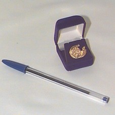 BÓTON (2X1,5 CM) EM METAL DOURADO. SÍMBOLO DA CÚPULA DO G-15 (UM GLOBO ENVOLTO PELA LETRA 'G' E, AO LADO, O NÚMERO '15'). ACONDICIONADO EM CAIXA (4,2X3,6X3,5 CM) PARA JÓIAS, NA COR AZUL MARINHO.