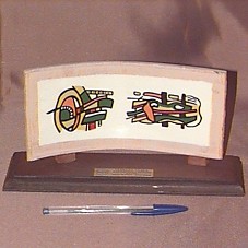 PINTURA (19X7 CM) EM MINI MURAL (22X10 CM) DE CERÂMICA. RÉPLICA DA OBRA DE FERNAND LEGER, SITUADA NA 'PLAZA CUBIERTA DEL RECTORADO', NA UNIVERSIDADE CENTRAL DA VENEZUELA. DESENHOS ABSTRATOS, PREDOMINANDO OS TONS DE VERDE, AMARELO , PRETO E VERMELHO. FIXADA EM BASE DE MADEIRA (26X8X1,5 CM). NA FRENTE, PLACA COM A INSCRIÇÃO 'UCV / FERNAND LEGER / PLAZA CUBIERTA DEL RECTORADO / REPLICA / VICTOR MARQUEZ - JESUS GARCIA'.